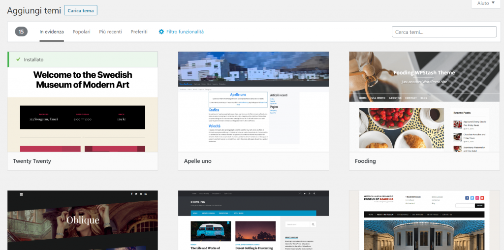 A questo punto possiamo cercare fra i migliaia di temi gratis proposti direttamente da WordPress.