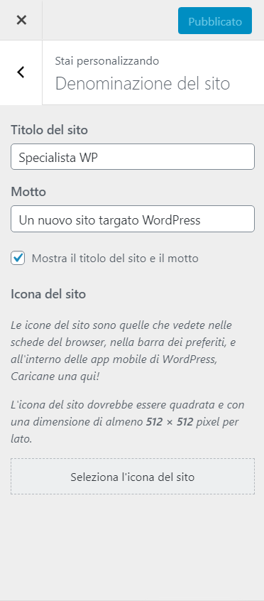 Cancelliamo il motto e successivamente andiamo ad inserire un’icona al nostro sito, cliccando su “Seleziona l’icona del sito“