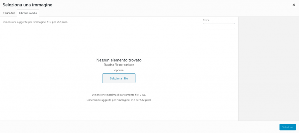 Clicchiamo sulla scheda “Carica file“, selezioniamo un’immagine dal nostro computer e infine clicchiamo sul pulsante blu “Seleziona” per inserire l’immagine scelta come icona per il nostro sito.