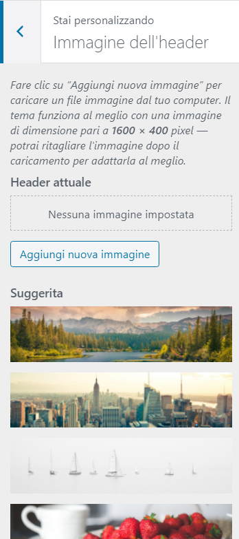 Il tema ci propone già alcune immagini, ma possiamo inserire quella che vogliamo cliccando su “Aggiungi nuova immagine“.