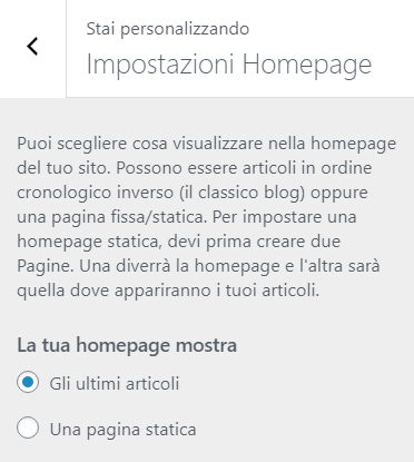 Questa opzione è presente in ogni tema WordPress e ci consente di impostare il contenuto della nostra Homepage.