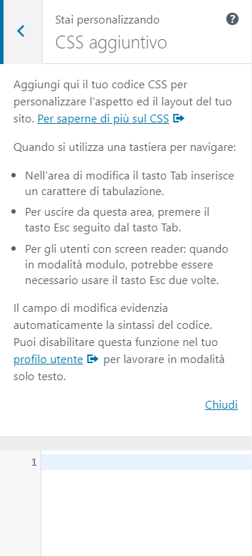 Questo punto ci permette di inserire del codice CSS da aggiungere allo stile del tema, per customizzare più nel dettaglio alcuni particolari del sito.
