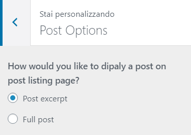 Dato che questa opzione riguarda la pagina archivio dove sarà presente l’elenco dei nostri post è preferibile lasciare “Post excerpt“. Chi vorrà leggere il contenuto intero potrà cliccare sull’articolo per aprirlo in una pagina a sè stante.
