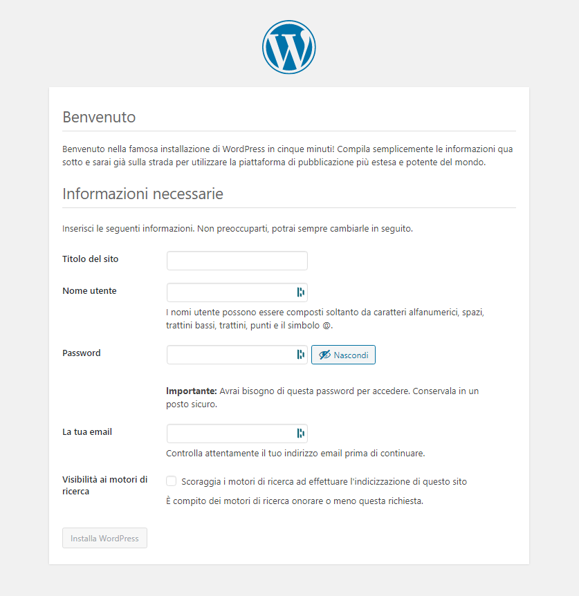 Compilati i campi puoi cliccare su “Installa WordPress“