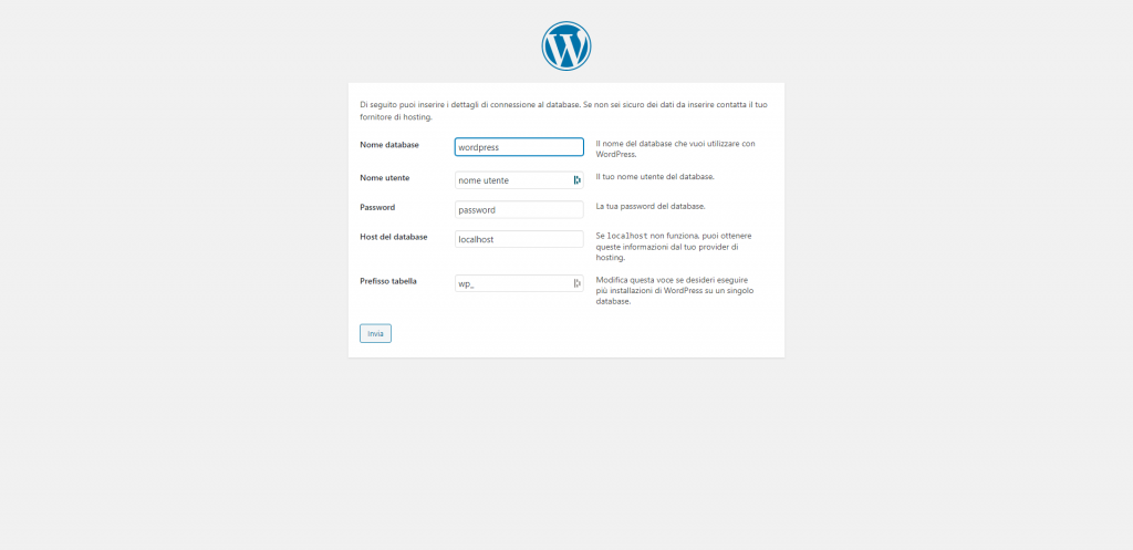 - Nome database: è il nome che abbiamo dato prima al database creato con phpmyadmin, in questo caso “wp-test“.