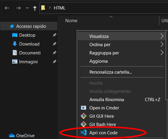 Creiamo una cartella sul desktop chiamata “HTML“. Ora apriamo questa cartella con VS Code, facendo click con il tasto destro del mouse all’interno della cartella e cliccando “Apri con Code“