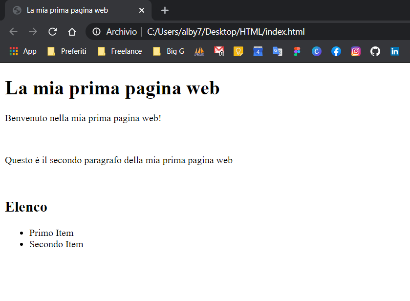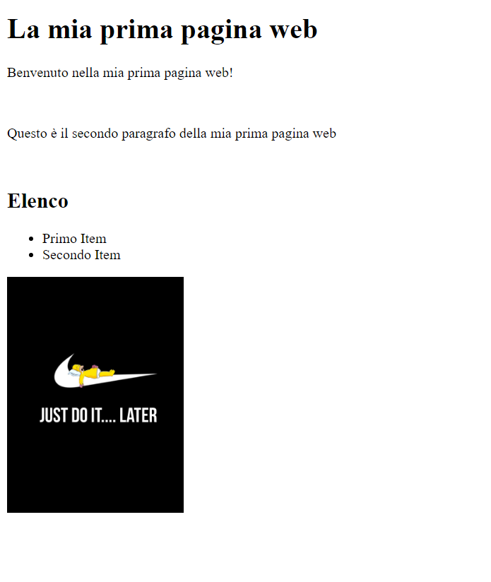 <h1>La mia prima pagina web</h1> <p>Benvenuto nella mia prima pagina web!</p> <br><!-- questo è un a capo--> <p>Questo è il secondo paragrafo della mia prima pagina web</p> <br> <h2>Elenco</h2> <ul> <li>Primo Item</li> <li>Secondo Item</li> </ul>Ora salva la pagina e aggiornala nel browser, vedrai comparire del contenuto!